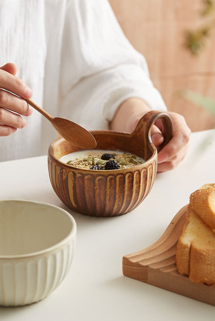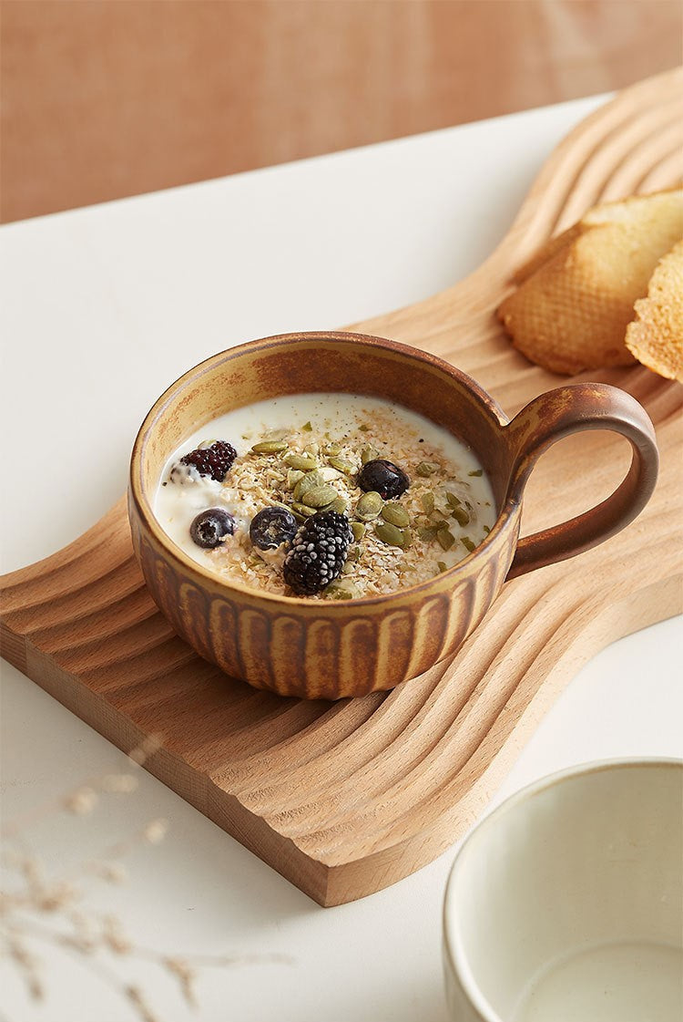Crafted with a distinctive grooved pattern and a subtly weathered glaze, each cup offers a tactile experience that blends artisanal warmth with timeless simplicity. The broad 400ml capacity makes it perfect for coffee, milk, oatmeal, or breakfast drinks, while the sturdy handle ensures a comfortable grip.