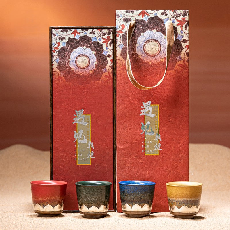 Inspired by the ornate lotus patterns found in Dunhuang’s ancient zaojing (caisson ceilings), each cup is adorned with a delicate silver-painted lotus petal band, symbolizing purity, renewal, and the harmony of the four seasons. The set features four glaze colors — crimson, forest green, deep azure, and golden ochre — representing spring, summer, autumn, and winter.