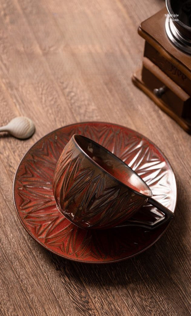 Where carved relief meets modern geometry — this vintage-inspired coffee cup & saucer set brings textured elegance to everyday coffee moments.