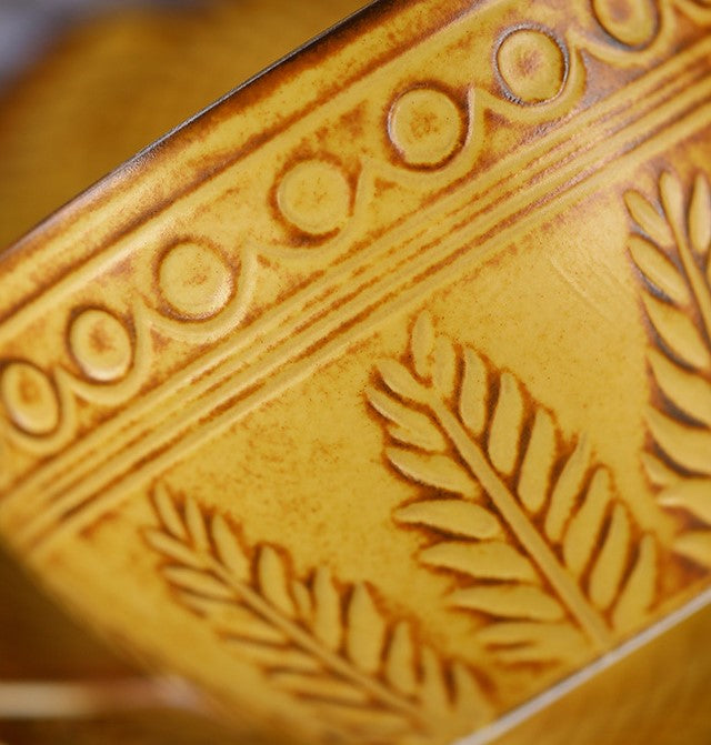 - Rustic Elegance — The golden-brown glaze with leaf and ring motifs conveys a sense of earthy warmth, making each sip feel connected to nature. The carved details enhance its vintage charm, perfect for cozy coffee or tea rituals.