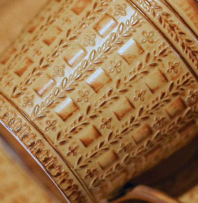 - Artisan Texture — The glaze enhances the relief pattern with soft depth, from the warm amber tone to the subtle ivory finish. This layered surface adds richness to the tactile experience, making each set not just functional but collectible.