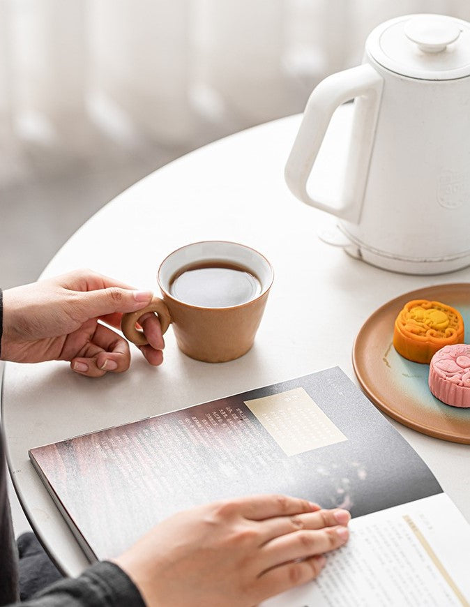 This piece is designed for those who appreciate refined simplicity in the everyday — a quiet companion for morning espressos, afternoon pick-me-ups, or desk-side coffee breaks. Its sculptural ring handle offers a playful touch, while the matte ceramic finish adds understated elegance to any space.