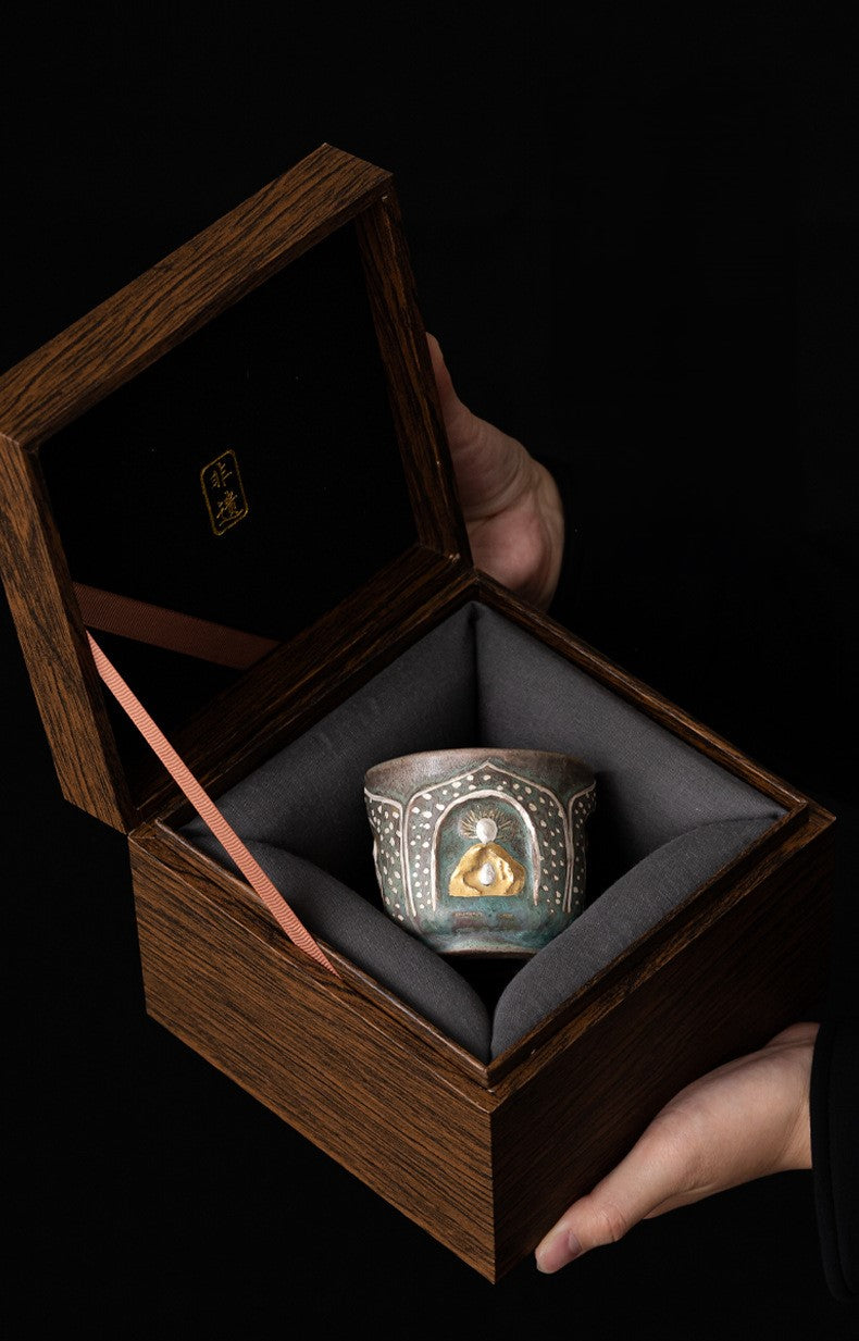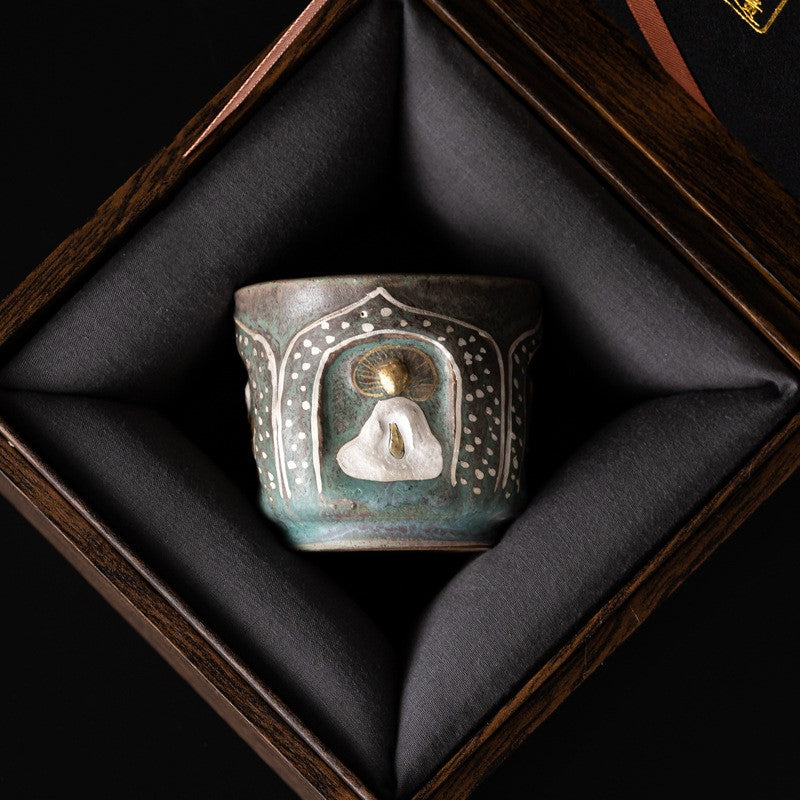 Fired at high temperatures, the cup showcases a hand-carved relief of a seated master figure, symbolizing wisdom, guidance, and gratitude. The surrounding archway is delicately dotted with white patterns and highlighted with gold, representing blessings and enlightenment.
