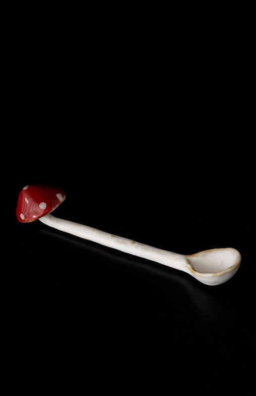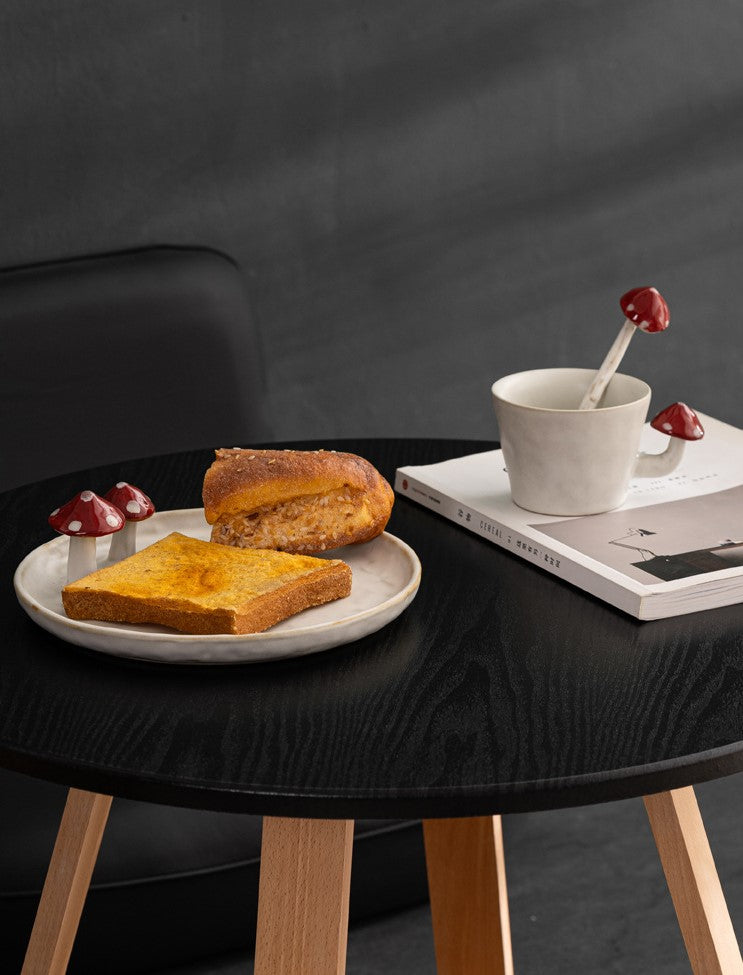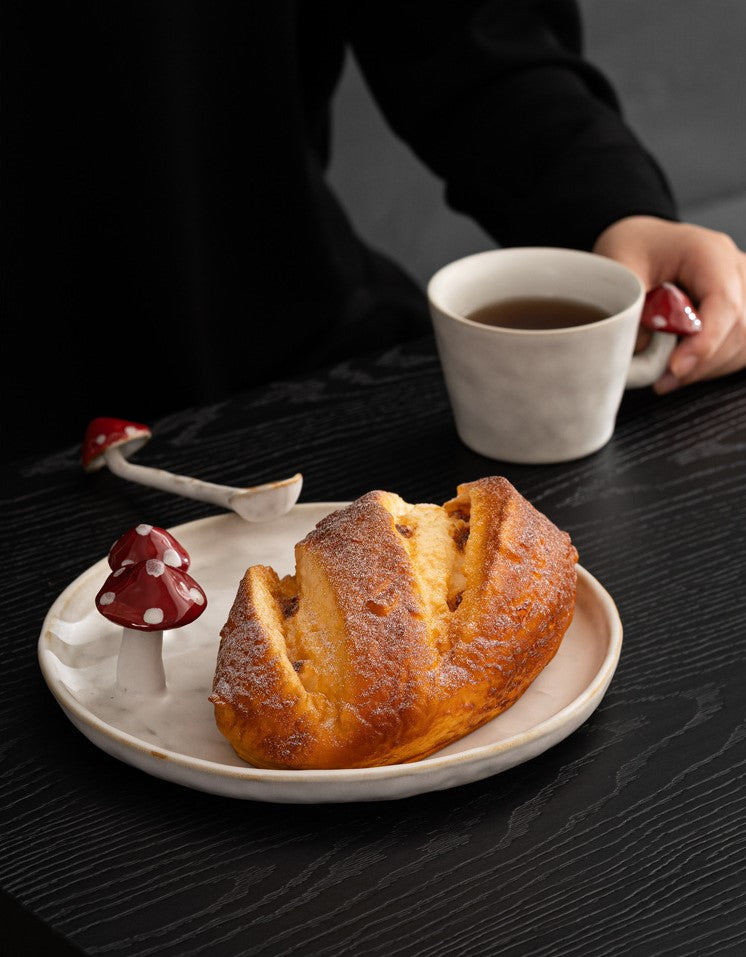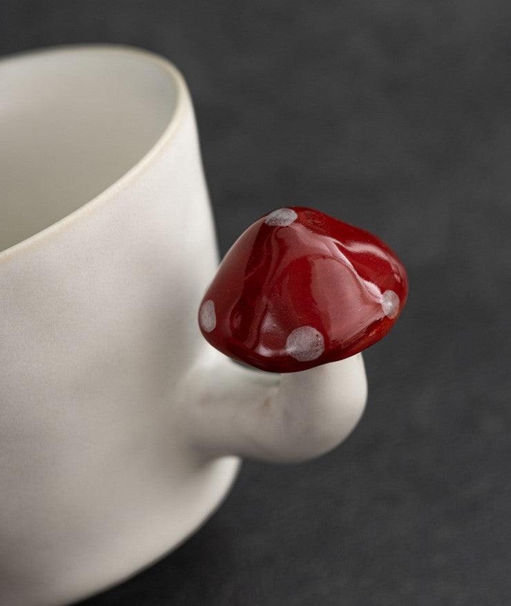 Includes: 1 × 250ml coffee cup with hand-sculpted mushroom handle, 1 × ceramic spoon with mushroom detail, 1 × round mushroom dessert plate