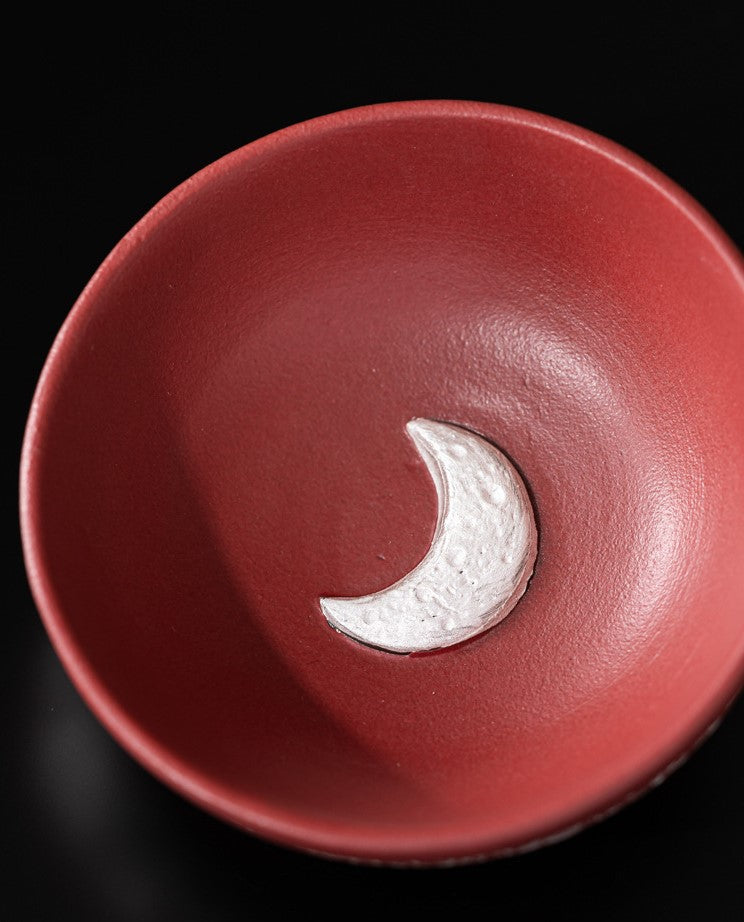 - The “Sun Cup” features an imperial red surface adorned with hand-painted gold, capturing the radiant glow of dawn. The “Moon Cup” is embellished with a silver-inlaid crescent, exuding quiet elegance under the night sky. The cup walls are finely textured, their mottled surface shimmering like a star-studded Milky Way, inviting boundless contemplation of the cosmos.