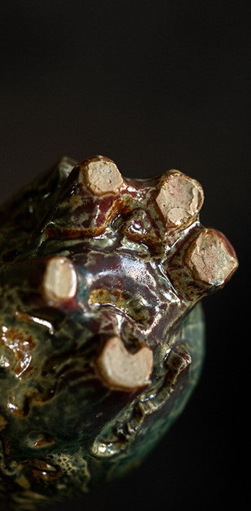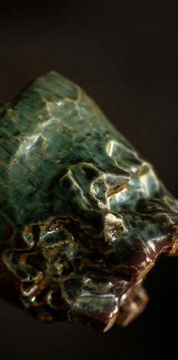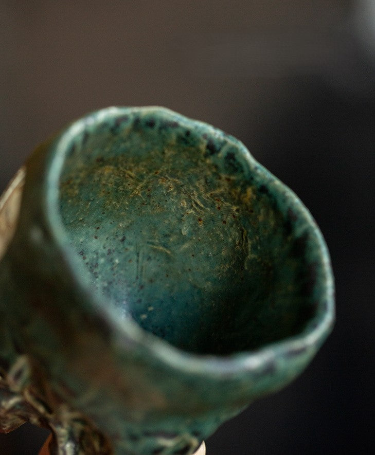 - Meticulously hand-carved and fired through multiple complex ceramic processes, each cup features an irregular silhouette and a deeply textured surface. Layers of glaze create a mottled, weathered patina reminiscent of ancient stone, giving each piece its own distinct character.