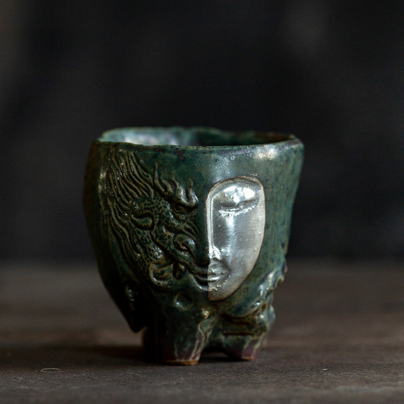 Fired at high temperatures, the cup features a dual-faced relief: one side in silver depicts serene compassion, while the other reveals the fierce vitality of a mythical beast. Together, they symbolize the balance of light and shadow, good and evil, and the transformative power of a single thought.
